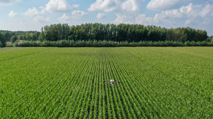 2024年8月8日,在吉林省梨樹縣孤家子鎮(zhèn),無人機為作物施肥(無人機照片)。新華社記者 張楠 攝