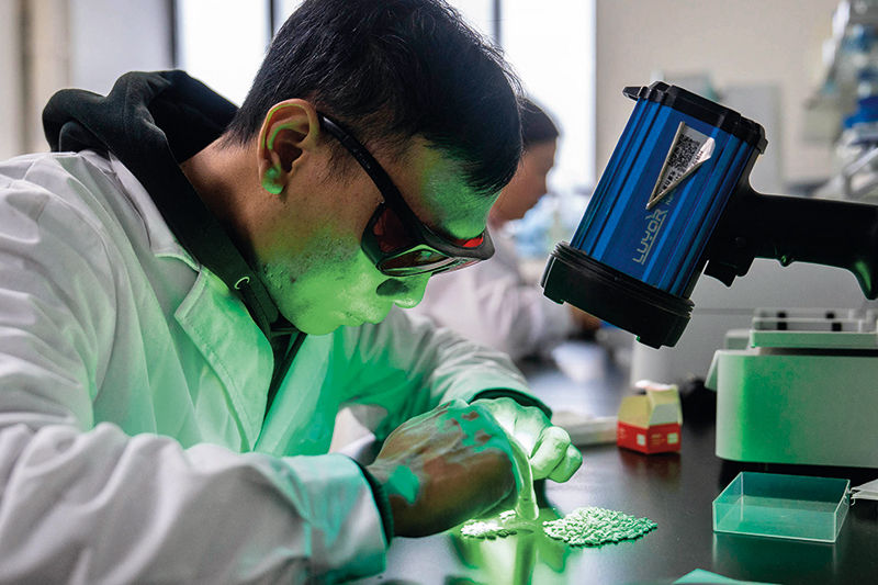 在湖南雜交水稻研究中心,工作人員通過熒光法進(jìn)行水稻樣本分析(2024年11月25日攝) 陳思汗攝 / 本刊