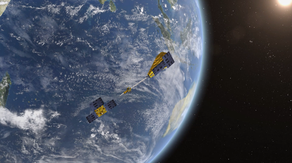 “澳科一號(hào)”衛(wèi)星在軌示意圖(右為A星,左為B星)。圖片由澳門科技大學(xué)“澳科一號(hào)”團(tuán)隊(duì)提供