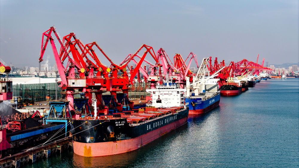 在山東港口日照港煤炭泊位,貨輪停泊卸煤(2024年12月4日攝,無人機照片)。新華社記者 郭緒雷 攝