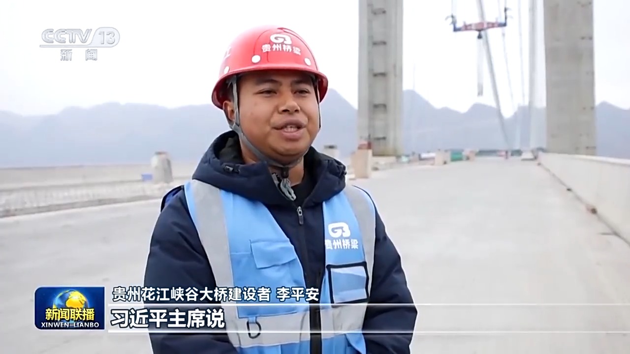 貴州花江峽谷大橋建設(shè)者 李平安:習(xí)近平主席說,新征程上,每一個人都是主角。我覺得非常自豪,心里也感到非常溫暖。我們正在建設(shè)的花江峽谷大橋春節(jié)前后即將合龍,將是世界第一高橋。我們一定會認(rèn)真細(xì)致,高質(zhì)量地完成工程任務(wù),把中國式現(xiàn)代化的美好愿景,書寫在祖國的山川河流之間。