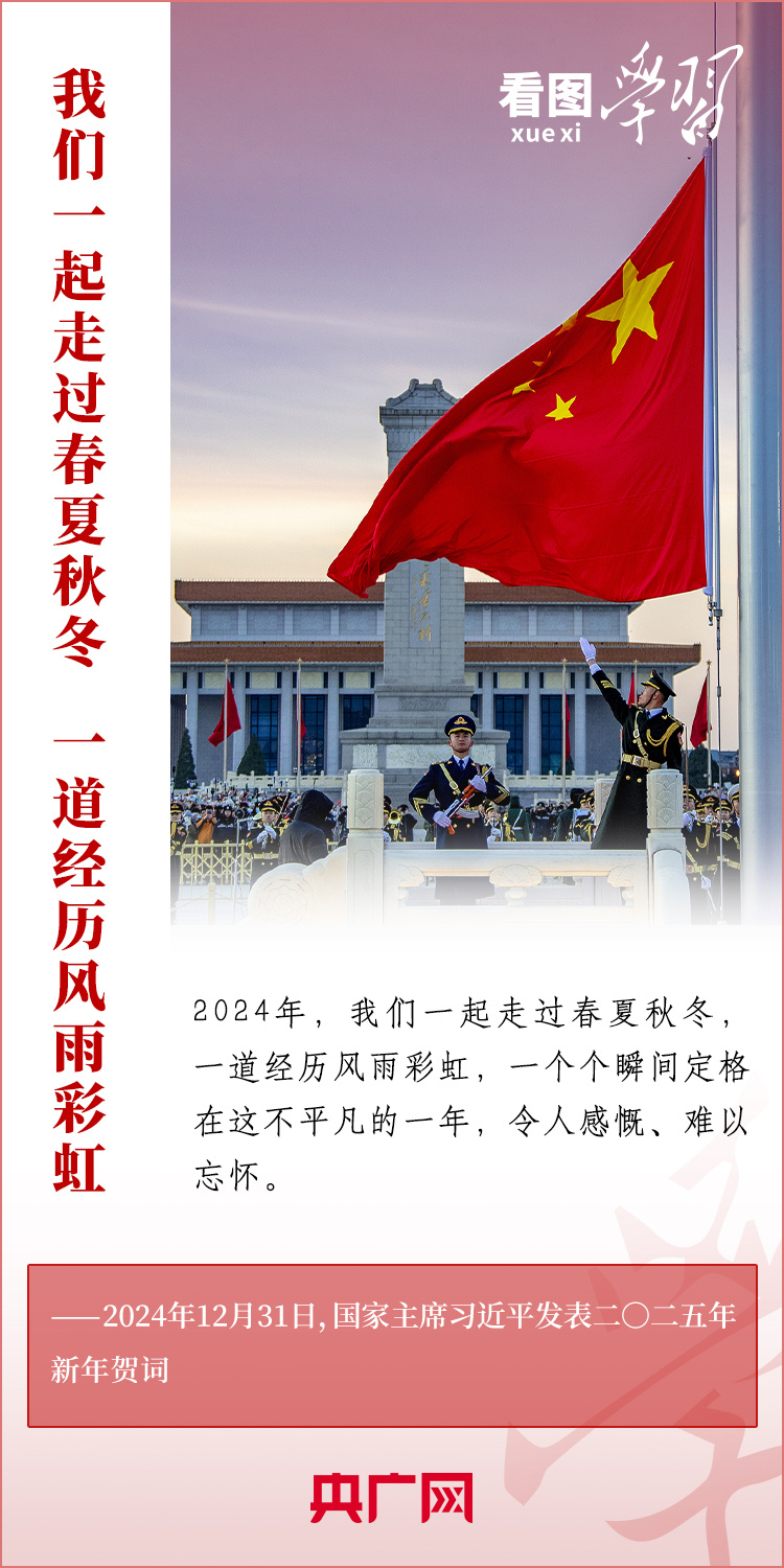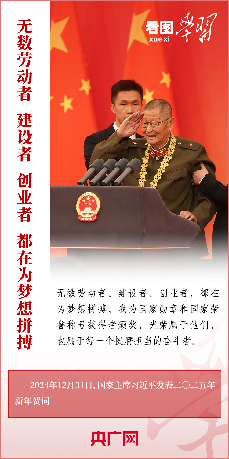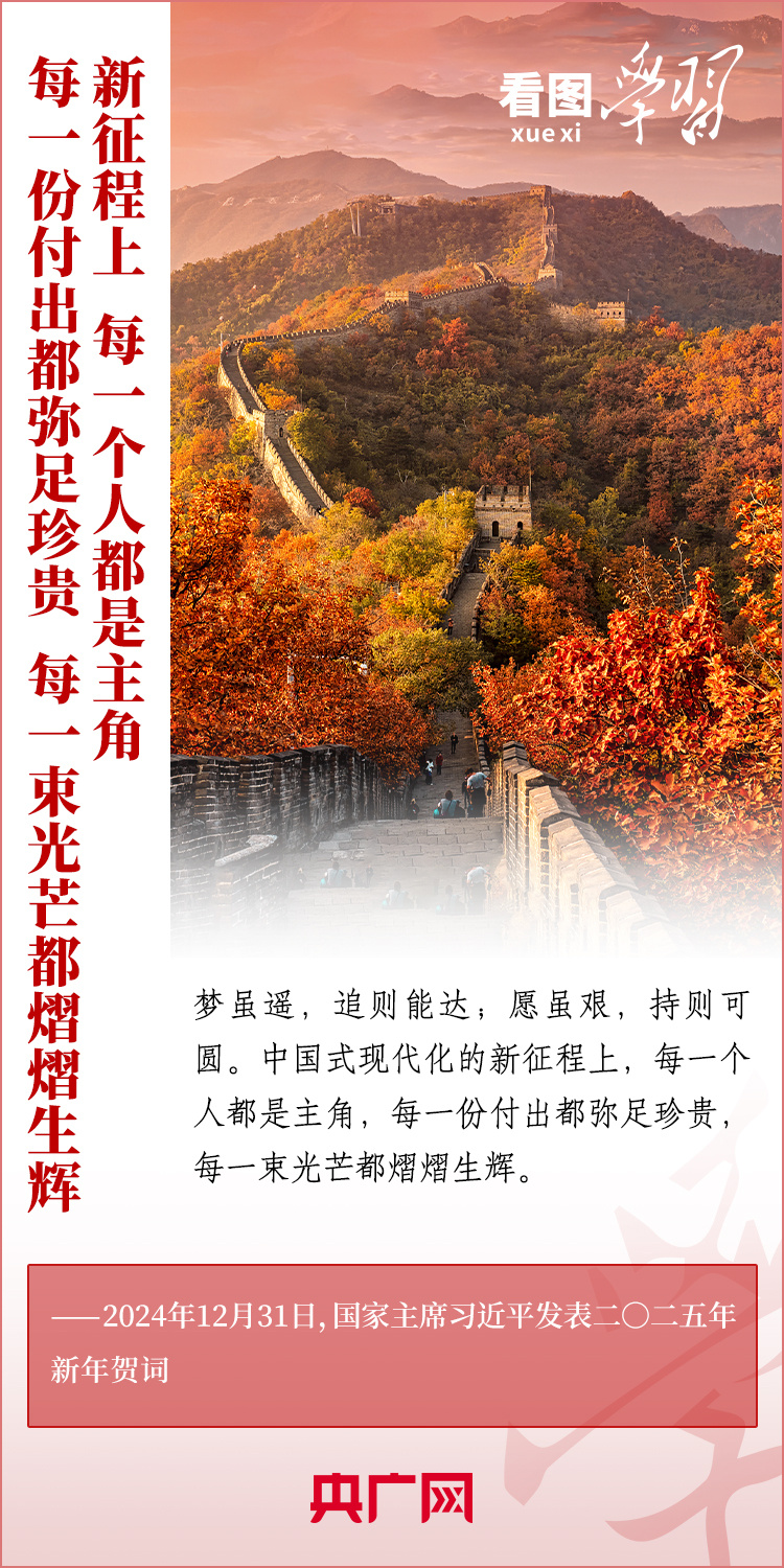“夢雖遙,追則能達;愿雖艱,持則可圓?!毙履昵跋?,習近平主席發(fā)表二〇二五年新年賀詞。在溫暖有力的講述中,習主席深情回望過去一年中國不平凡的奮斗歷程、精彩瞬間,感慨大家一道經(jīng)歷的風雨彩虹、難忘時刻,贊美無數(shù)為夢想拼搏的勞動者、建設(shè)者、創(chuàng)業(yè)者。習主席說,中國式現(xiàn)代化的新征程上,每一個人都是主角,每一份付出都彌足珍貴,每一束光芒都熠熠生輝。讓我們充滿信心,在新的一年接續(xù)奮斗!