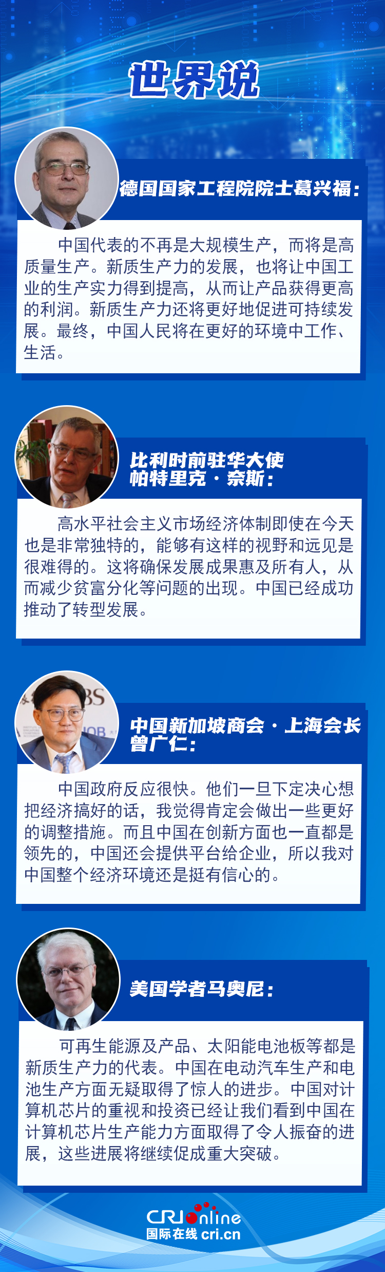多位國際人士對中國經(jīng)濟發(fā)展充滿信心,高度肯定中國政府在經(jīng)濟發(fā)展中的核心引領作用,并對中國在高質量生產及高精尖領域的創(chuàng)新領先地位表示贊賞。