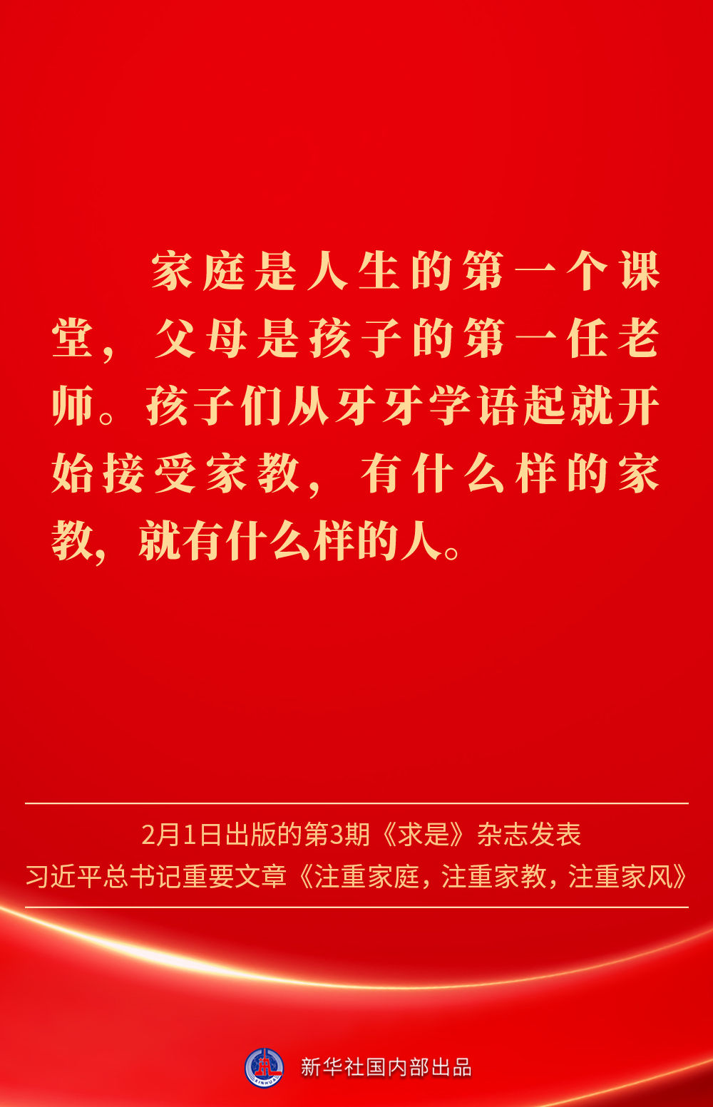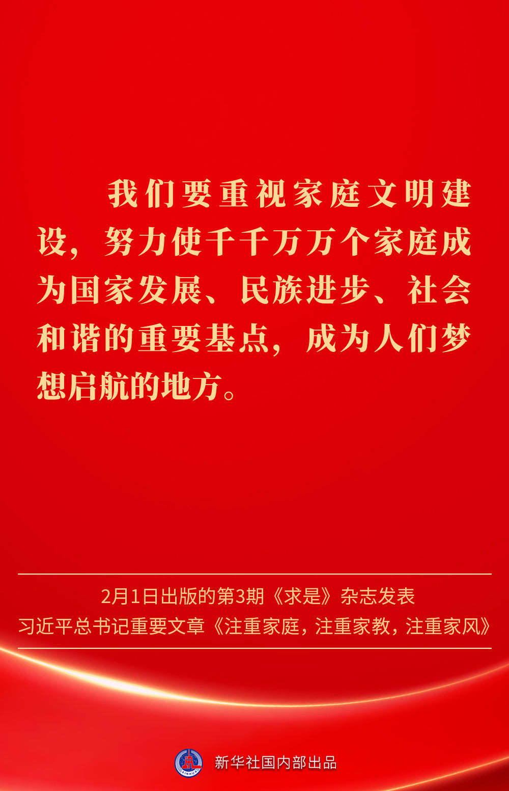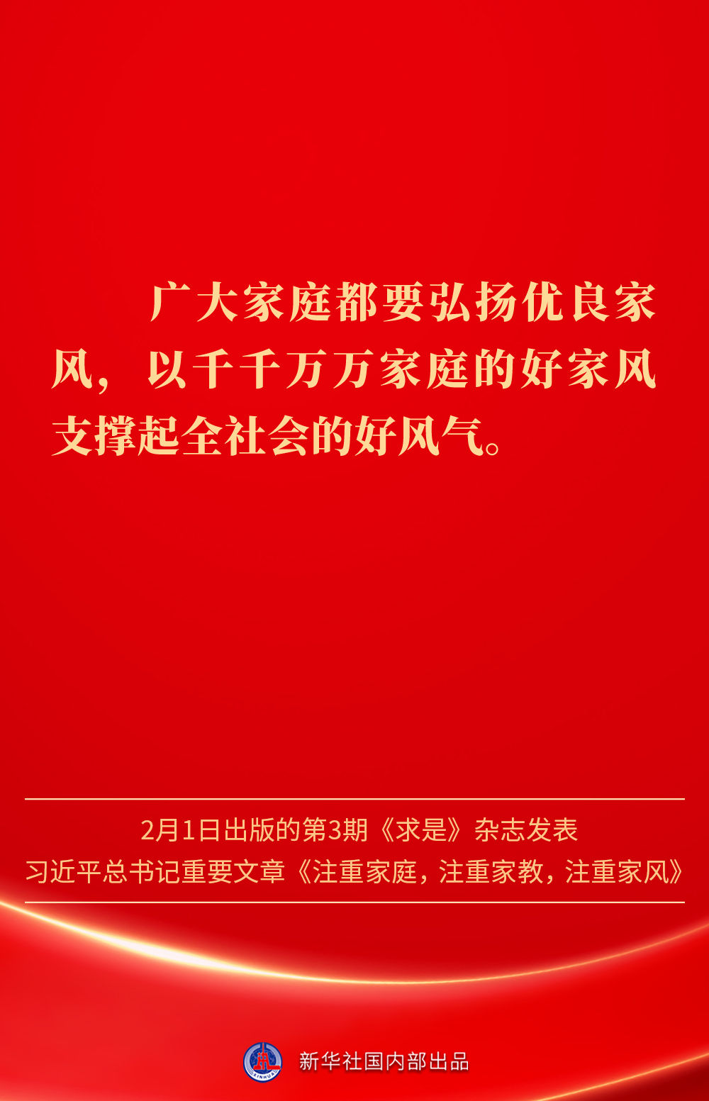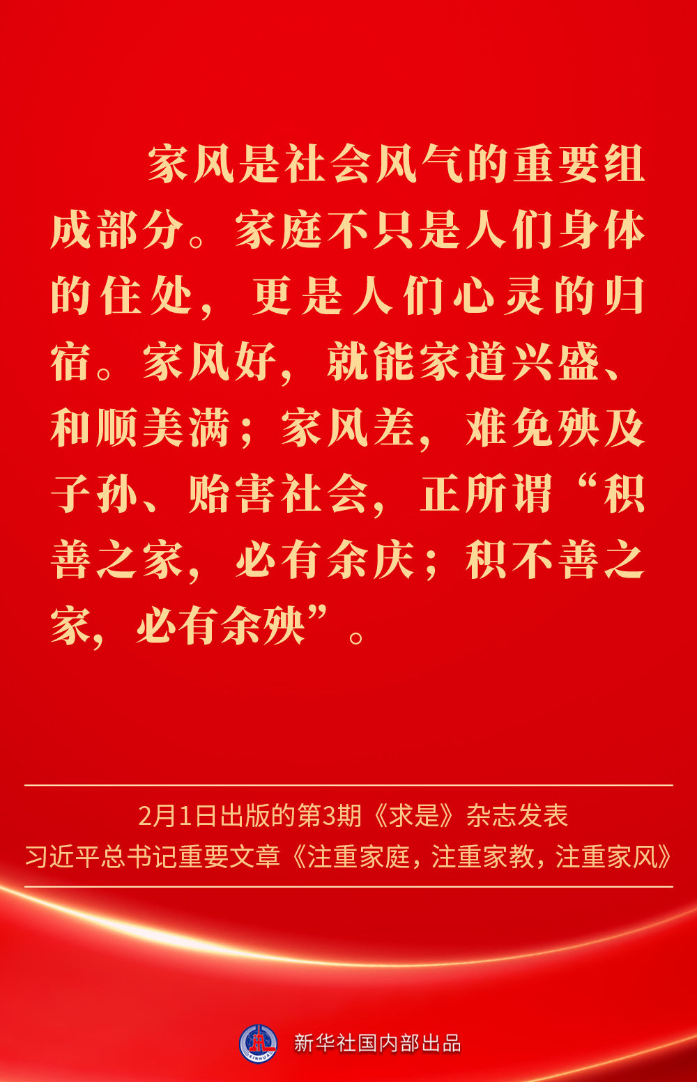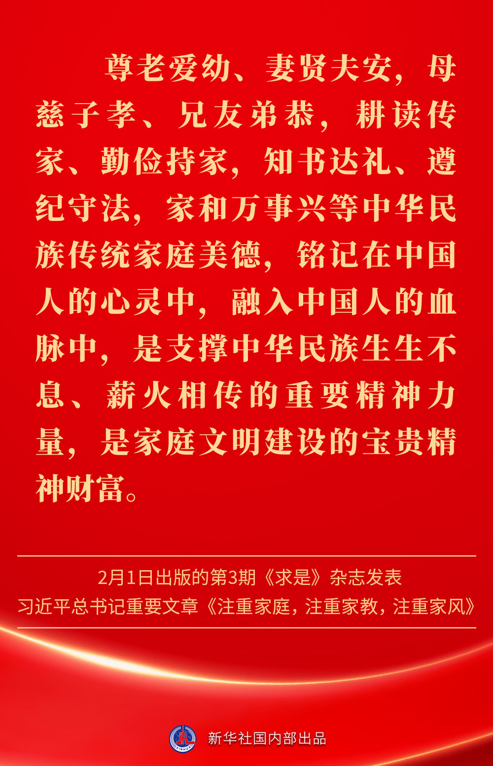 萬家團圓共慶新春佳節(jié)之際,2月1日出版的第3期《求是》雜志發(fā)表習(xí)近平總書記重要文章《注重家庭,注重家教,注重家風(fēng)》。為什么要注重家庭、家教、家風(fēng)?如何做好家庭文明建設(shè)?習(xí)近平總書記這樣闡述——