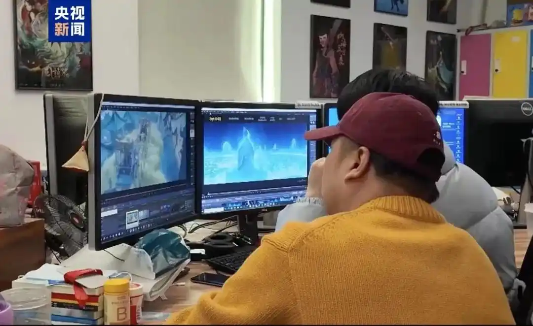 《哪吒2》壯觀的特效背后,是全國(guó)138家動(dòng)畫(huà)公司的合力托舉。圖為創(chuàng)作團(tuán)隊(duì)正在確認(rèn)畫(huà)面效果。