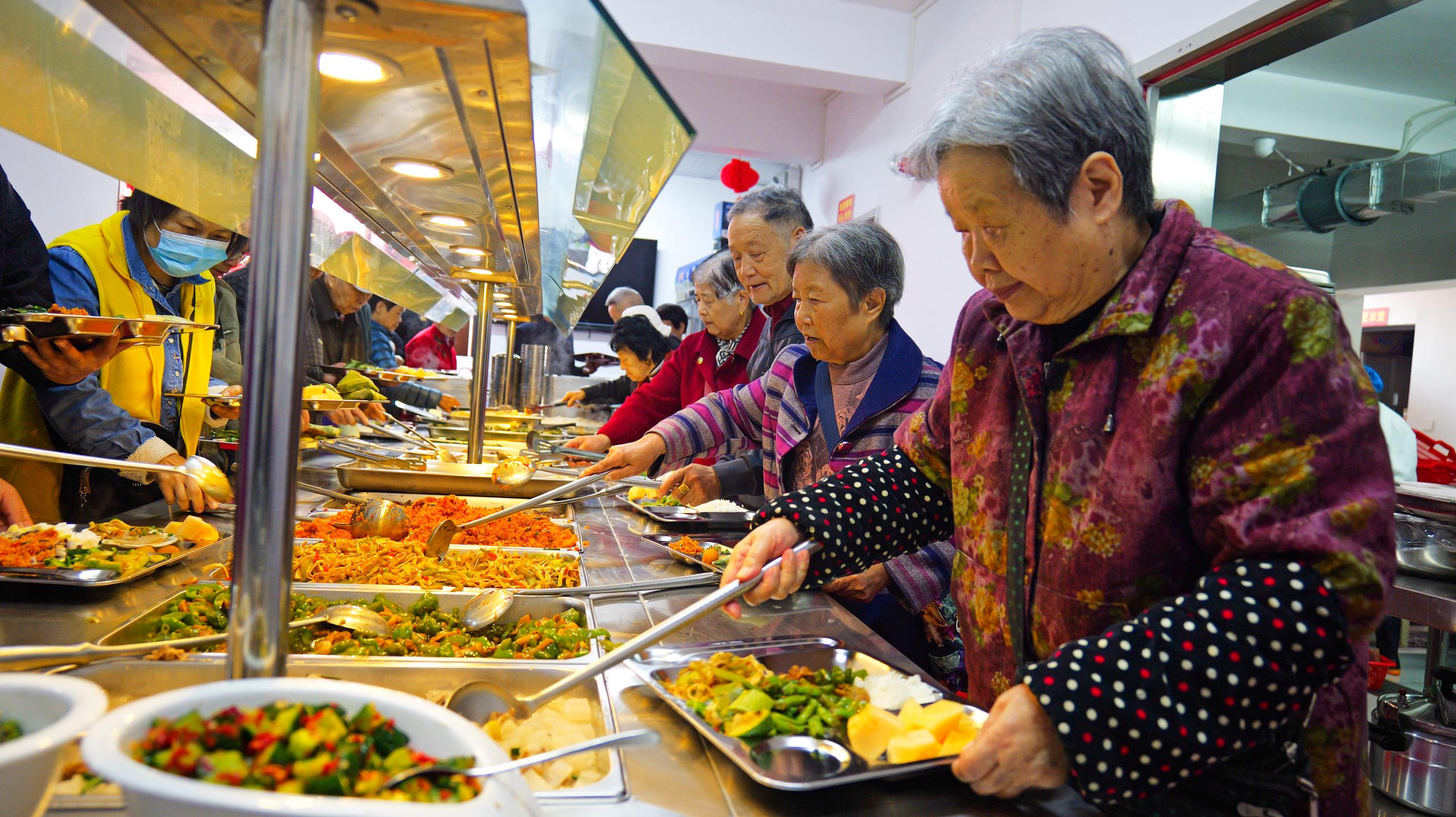 湖北恩施一社區(qū)“幸福食堂”里,社區(qū)老人、退休職工在排隊(duì)取餐。