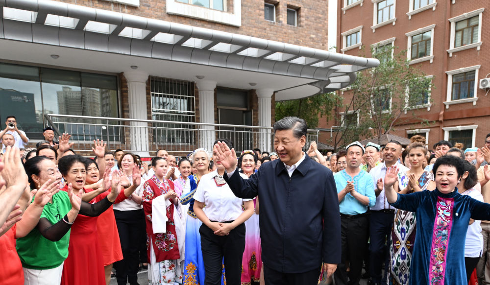 2022年7月13日上午,習(xí)近平在新疆烏魯木齊市天山區(qū)固原巷社區(qū)考察時,身著民族服裝的各族群眾簇?fù)碓诳倳浬磉?,載歌載舞,向總書記表達由衷的愛戴。