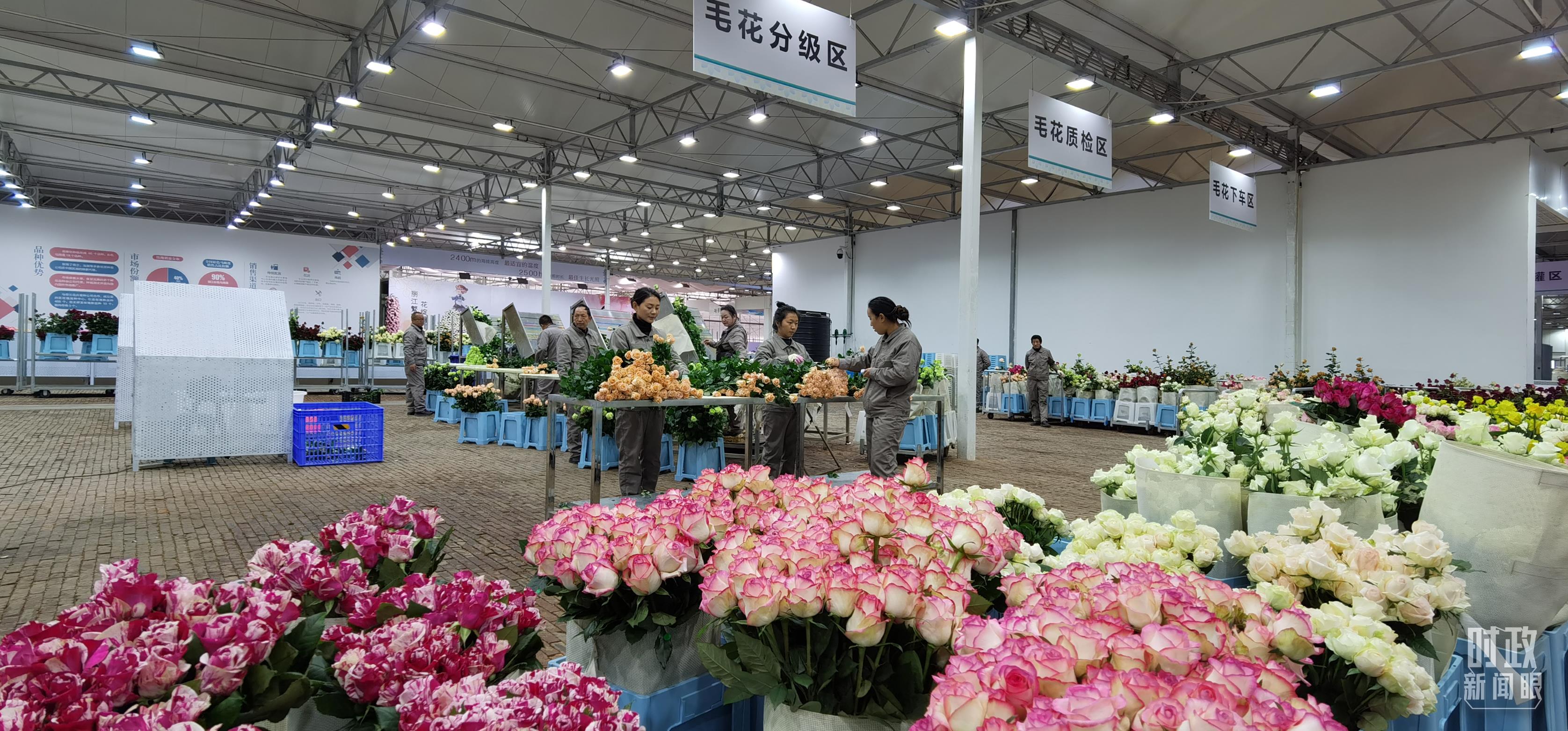麗江現(xiàn)代花卉產(chǎn)業(yè)園內(nèi),工人正在分類(lèi)整理鮮花。(總臺(tái)央視記者郭鴻拍攝)