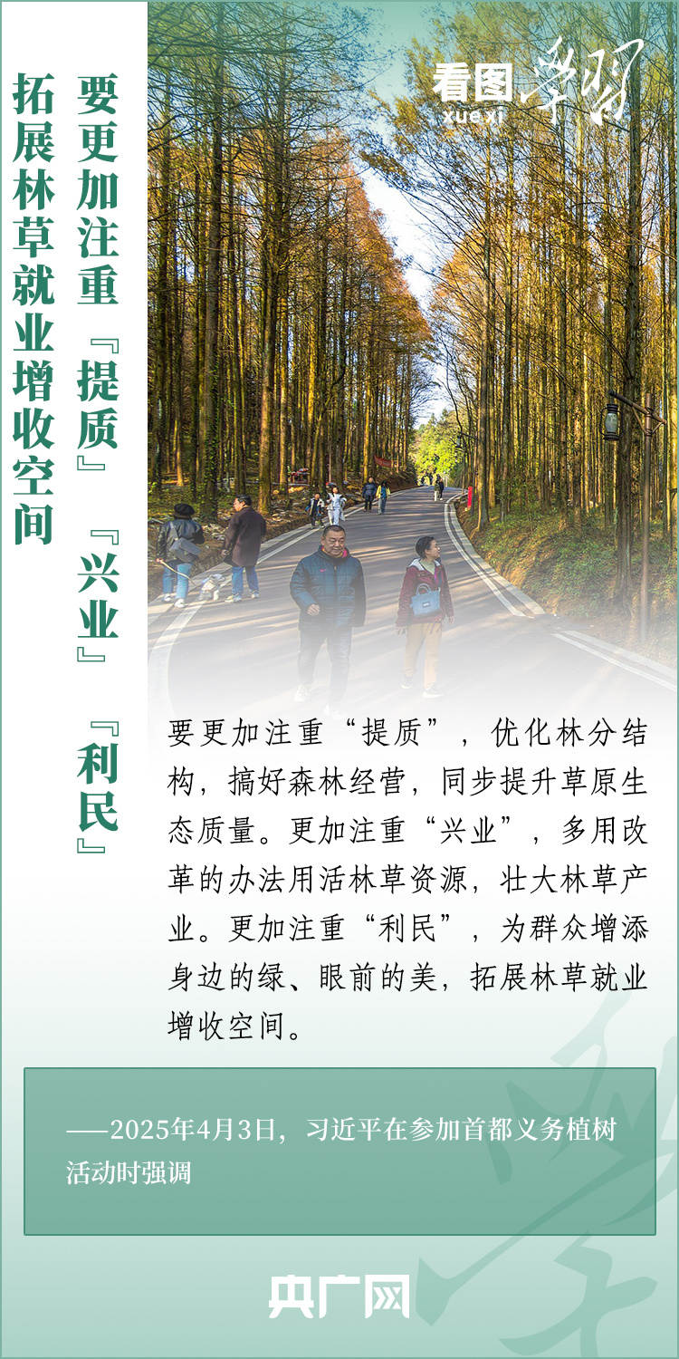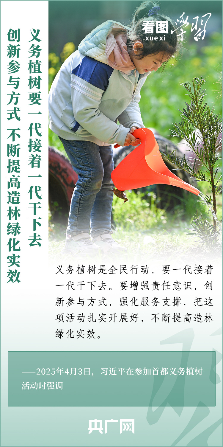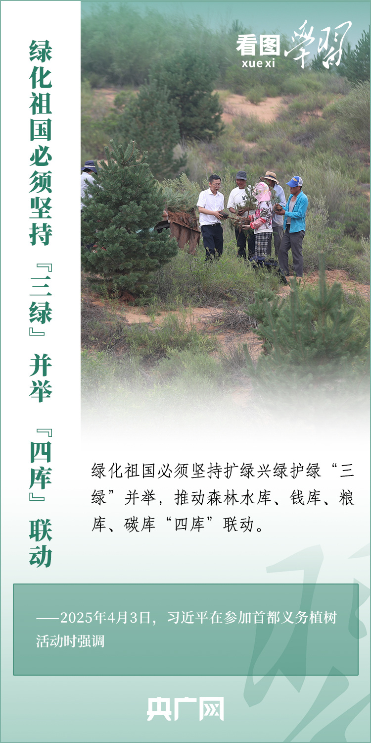 植樹造林是生態(tài)文明建設(shè)重要一環(huán)。4月3日,習(xí)近平總書記參加首都義務(wù)植樹活動。在植樹現(xiàn)場,總書記高度肯定國土綠化工作取得來之不易的成績,強調(diào)綠化祖國必須堅持“三綠”并舉、“四庫”聯(lián)動,要更加注重“提質(zhì)”“興業(yè)”“利民”,“匯聚共建美麗中國的磅礴力量,讓祖國大地更加綠意盎然、生機勃發(fā)”。一起來學(xué)習(xí)!