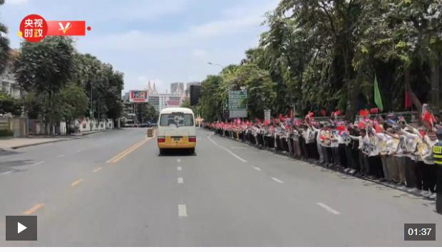 當?shù)貢r間4月17日上午,國家主席習近平抵達柬埔寨首都金邊??偱_隨團時政記者跟隨車隊獨家記錄金邊萬人歡迎盛況。