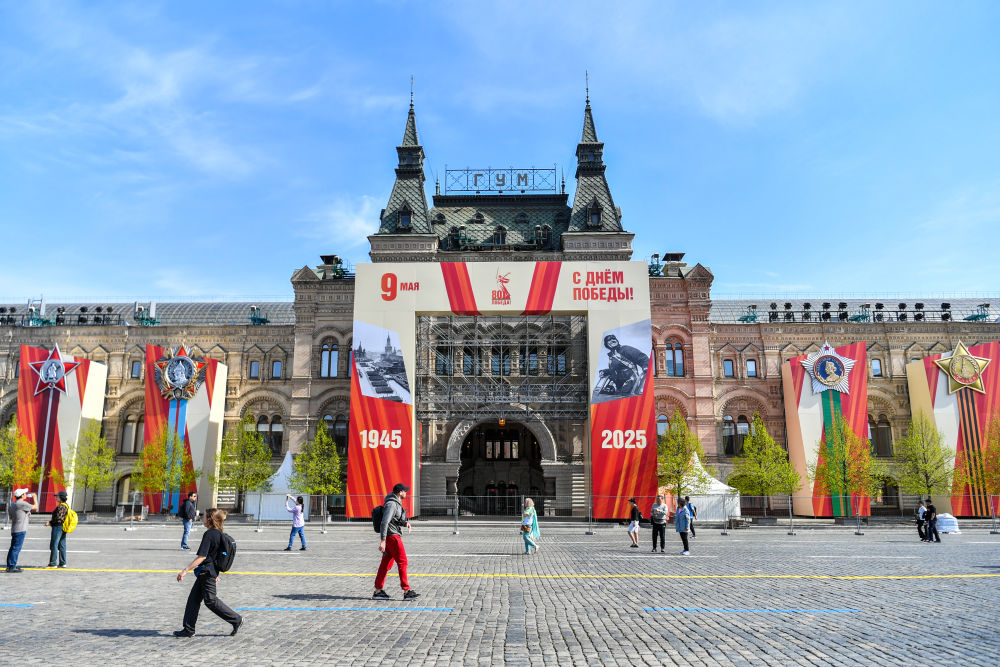 紀念蘇聯(lián)偉大衛(wèi)國戰(zhàn)爭勝利80周年慶典前夕,莫斯科街頭,寫有“勝利”字樣的旗幟隨風(fēng)飄揚。在路邊,以蘇聯(lián)衛(wèi)國戰(zhàn)爭歷史為主題的圖片展板和裝飾櫥窗吸引行人停下腳步,或合影留念,或瀏覽沉思。