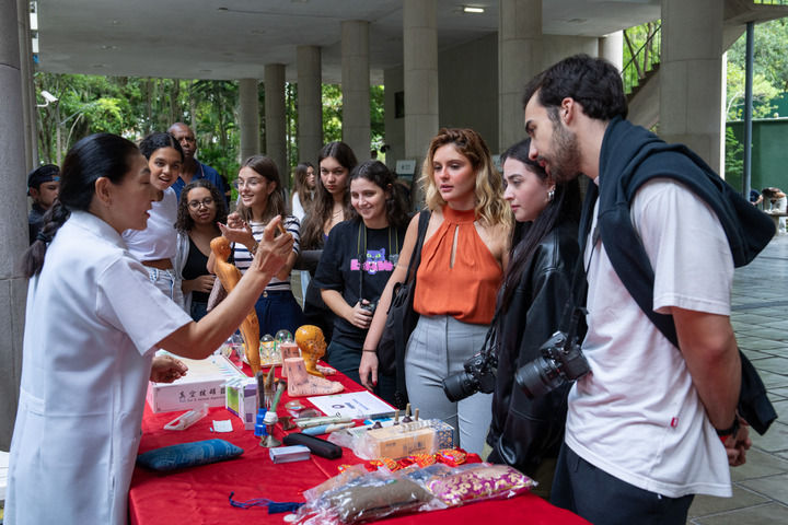 2025年4月15日,在巴西里約熱內(nèi)盧天主教大學(xué)舉辦的“國際中文日”慶?;顒由?,學(xué)生們觀看中醫(yī)療法展示。