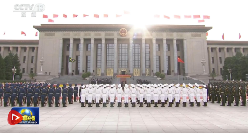 盧拉抵達(dá)時,禮兵列隊致敬。習(xí)近平同盧拉登上檢閱臺,軍樂團奏中巴兩國國歌,天安門廣場鳴放禮炮21響。盧拉在習(xí)近平陪同下檢閱中國人民解放軍儀仗隊,并觀看分列式。