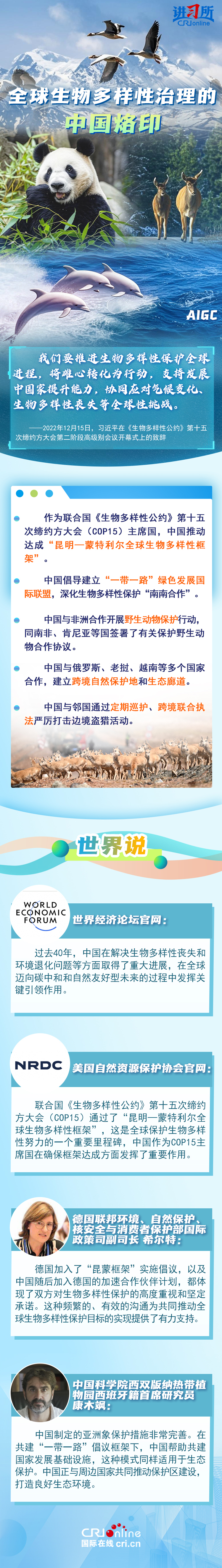 “心往一處想、勁往一處使,共建地球生命共同體?!弊鳛樽钤绾炇?、批準《生物多樣性公約》的締約方之一,生物多樣性保護已經上升為中國的國家發(fā)展戰(zhàn)略。國際人士表示,中國的一系列舉措體現出對生態(tài)環(huán)境保護的堅定決心,同時,中國依托共建“一帶一路”倡議等國際合作機制,為推動全球生物多樣性保護提供了有力支持,在邁向自然友好型未來的過程中發(fā)揮關鍵的引領作用。