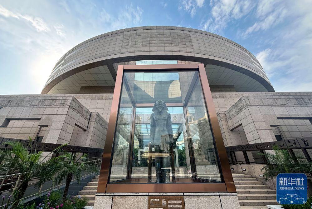 2024年7月17日在上海博物館人民廣場(chǎng)館南門拍攝的“金字塔之巔:古埃及文明大展”美內(nèi)普塔站像,這是上海博物館首次把文物展品放在室外展出。該展是近20年來埃及在境外舉辦的最大規(guī)模文物展,其中95%以上的文物是首次來到亞洲,于2024年7月19日正式向公眾開放,將持續(xù)至2025年8月。