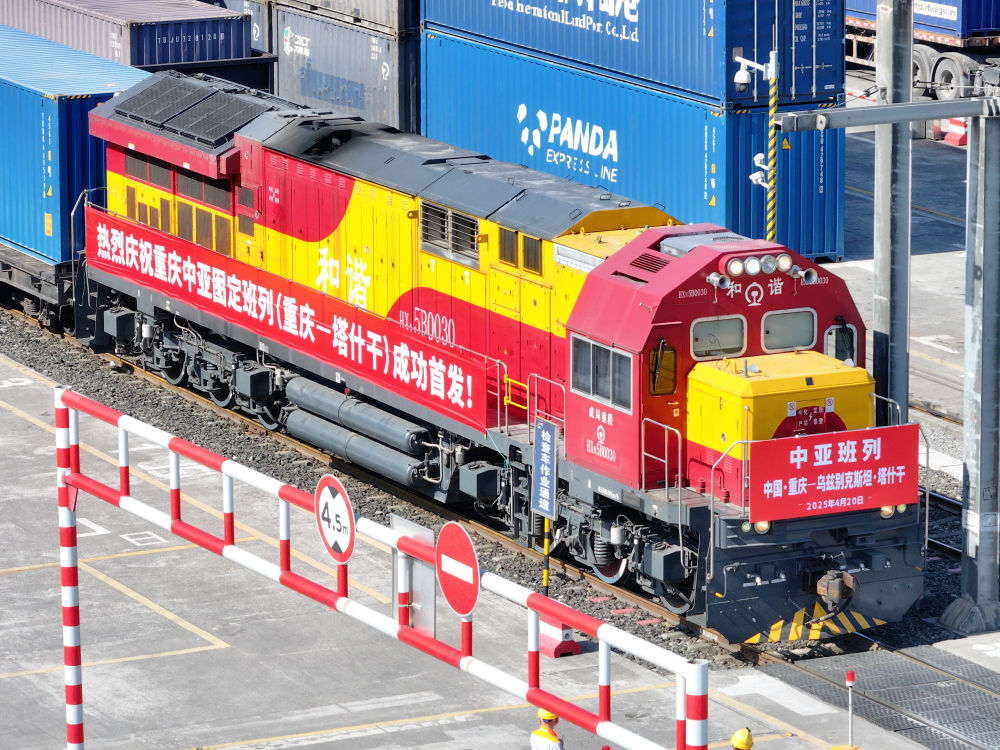4月20日,圖定中亞班列在重慶團結(jié)村中心站等候發(fā)車(無人機照片)。新華社記者 唐奕 攝