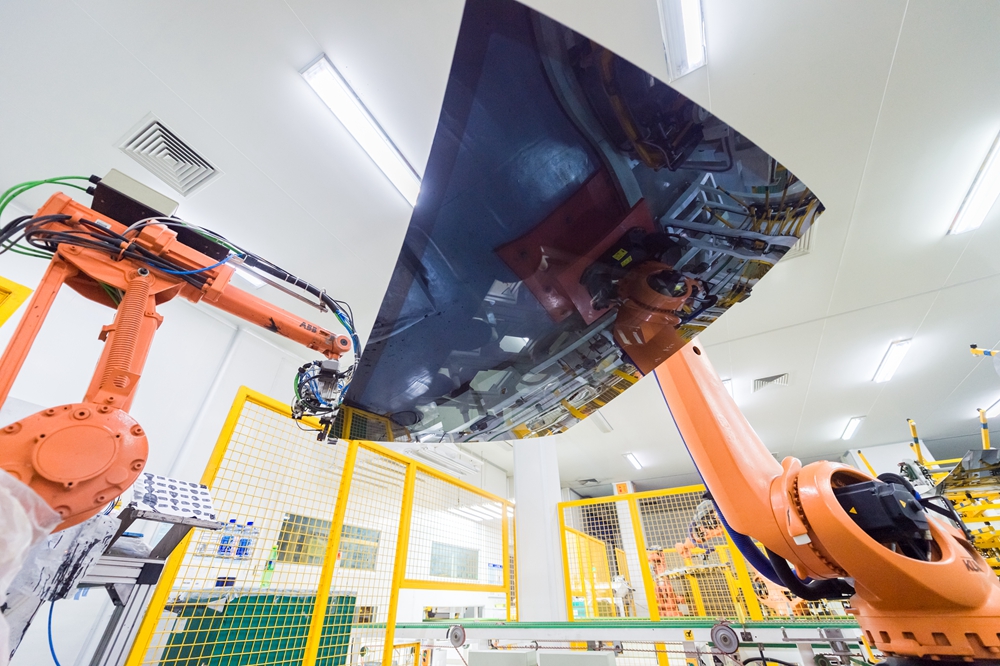 機(jī)械臂在福耀汽車(chē)玻璃智能工廠的車(chē)間生產(chǎn)玻璃產(chǎn)品