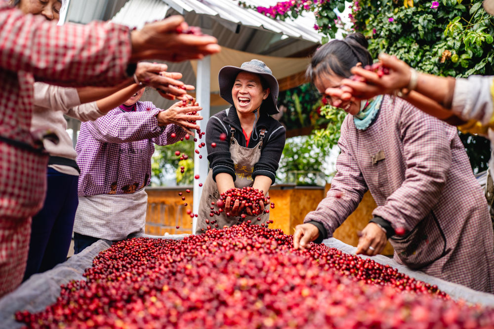 在云南省普洱市思茅區(qū)天玉咖啡莊園,莊園經(jīng)營(yíng)者玉噸(中)和工作人員慶??Х蓉S收(2025年1月8日攝)。新華社記者 胡超 攝
