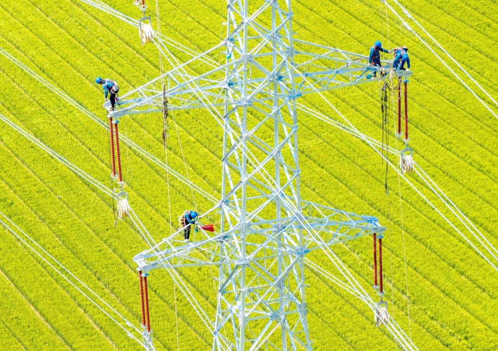 2025年5月4日,電力施工人員在江蘇省揚(yáng)州市江都區(qū)武堅(jiān)鎮(zhèn)至江蘇省興化經(jīng)濟(jì)開(kāi)發(fā)區(qū)的220千伏華電武堅(jiān)25萬(wàn)千瓦集中式光伏項(xiàng)目配套輸電線(xiàn)路上作業(yè)(無(wú)人機(jī)照片)。新華社發(fā)(任飛攝)