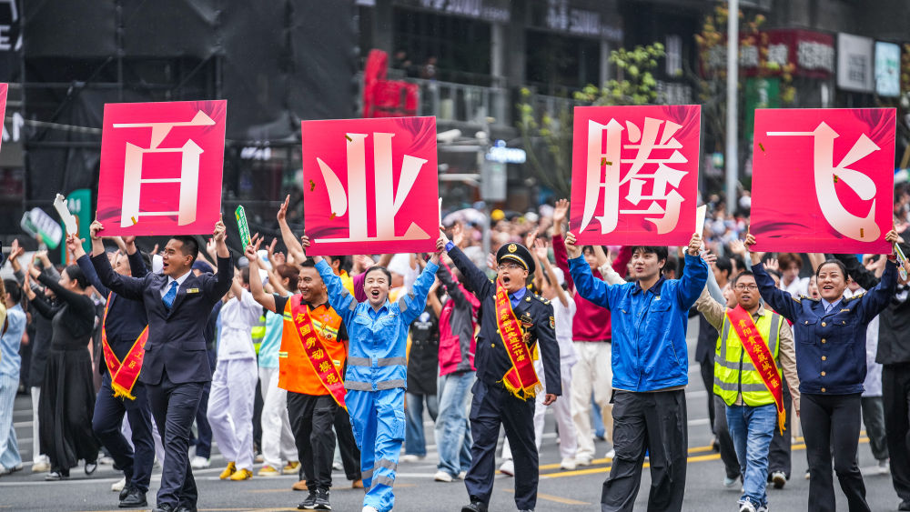 2025年5月18日,貴州民族團(tuán)結(jié)大巡游活動(dòng)在貴州省貴陽(yáng)市舉行。這是奮斗之光方陣的表演隊(duì)伍在進(jìn)行巡游。新華社記者 陶亮 攝