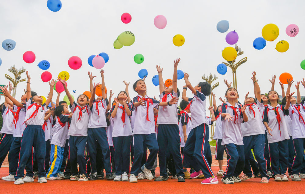 2024年5月8日,在湖南省永州市道縣第二小學(xué),學(xué)生放飛笑臉氣球。新華社發(fā)(蔣克青 攝)