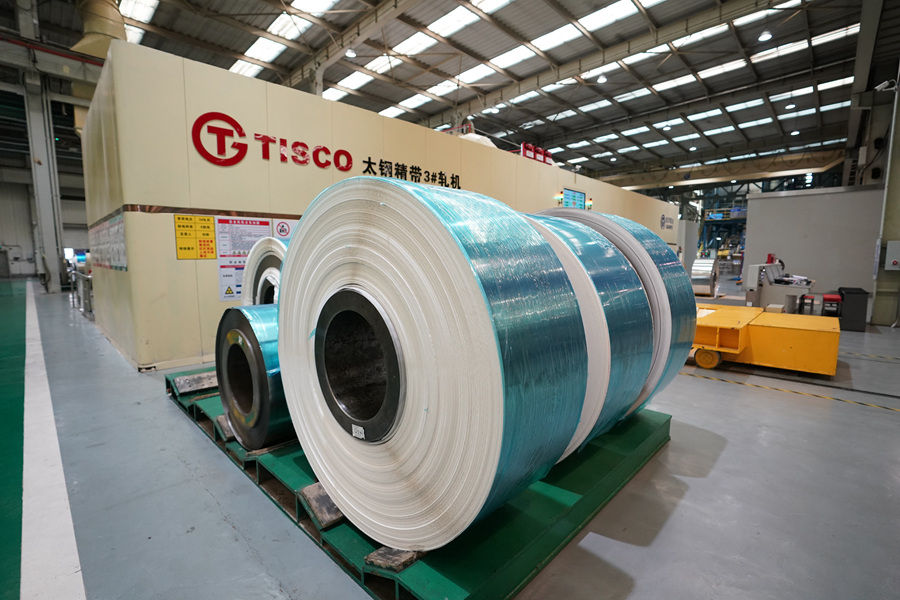 這是2023年10月24日拍攝的中國(guó)寶武山西太鋼不銹鋼精密帶鋼有限公司車(chē)間一角。一卷卷超薄“手撕鋼”產(chǎn)品擺放在車(chē)間內(nèi)。新華社記者 詹彥 攝