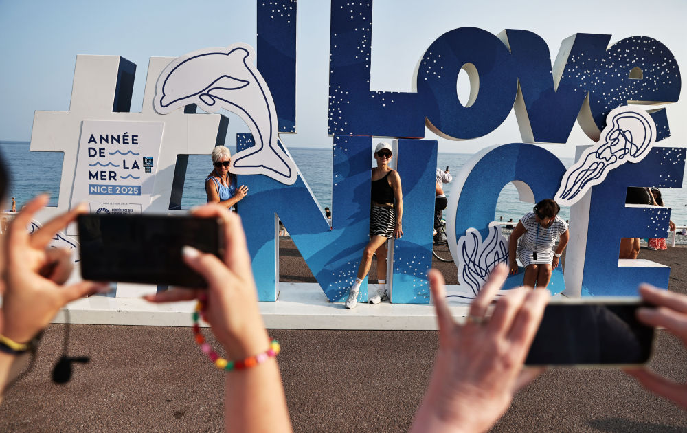 6月10日,在法國尼斯的盎格魯街上,人們在國際海洋年和第三屆聯合國海洋大會主題的景觀前拍照。新華社記者 高靜 攝