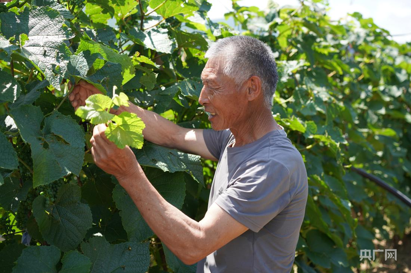 盛夏時(shí)節(jié),內(nèi)蒙古赤峰市喀喇沁旗馬鞍山村綠意盎然,一串串山葡萄綴滿枝頭,村民張國(guó)利和妻子趙國(guó)俠正忙著田間管護(hù)。“像這棵秧能結(jié)10斤左右山葡萄,一畝地能收約3000斤、賣6000元左右?!睆垏?guó)利說。