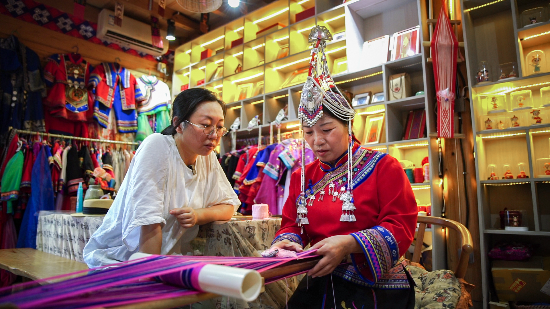 胡珊(左一)在庫村非遺工坊學做畬族彩帶(央廣網發(fā) 林港 攝)