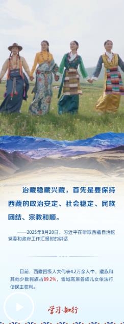 2025年8月20日,習(xí)近平總書(shū)記率中央代表團(tuán)乘專機(jī)抵達(dá)拉薩,出席西藏自治區(qū)成立60周年慶?;顒?dòng)。在聽(tīng)取西藏自治區(qū)黨委和政府工作匯報(bào)時(shí),習(xí)近平總書(shū)記強(qiáng)調(diào),“持續(xù)深入抓好穩(wěn)定、發(fā)展、生態(tài)、強(qiáng)邊四件大事,努力建設(shè)團(tuán)結(jié)富裕文明和諧美麗的社會(huì)主義現(xiàn)代化新西藏”。