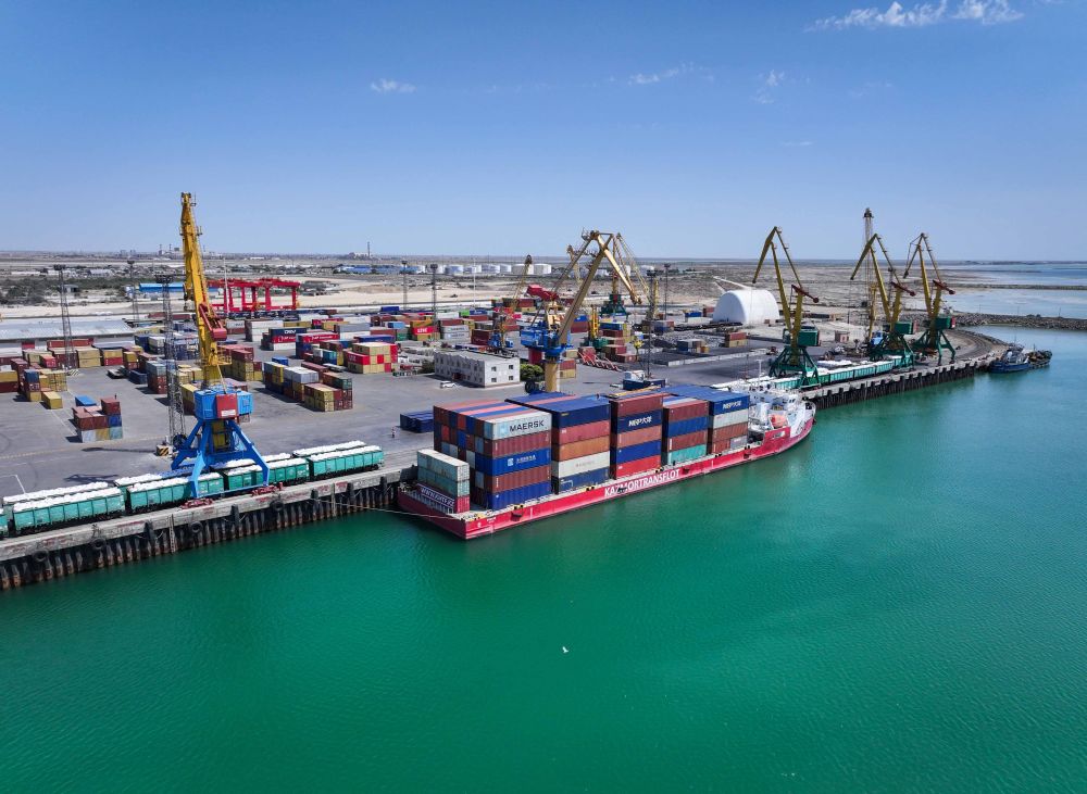 8月6日,一艘貨輪??吭诠_克斯坦阿克套港(無人機(jī)照片)。新華社記者 李任滋 攝