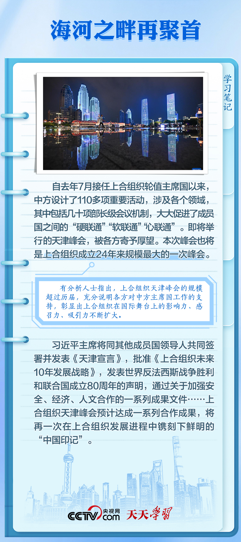 天天學(xué)習(xí)8月31日至9月1日,2025年上海合作組織峰會(huì)將在天津舉行。習(xí)近平主席將同20多位外國(guó)領(lǐng)導(dǎo)人和10位國(guó)際組織負(fù)責(zé)人聚首海河之濱,出席上合組織成立以來規(guī)模最大的一次峰會(huì)。