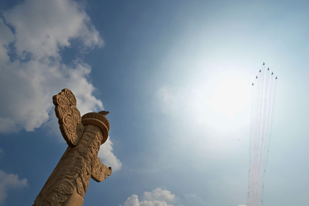 9月3日,紀(jì)念中國人民抗日戰(zhàn)爭暨世界反法西斯戰(zhàn)爭勝利80周年大會(huì)在北京隆重舉行。這是空中護(hù)旗梯隊(duì)接受檢閱。新華社記者 王婧嬙 攝