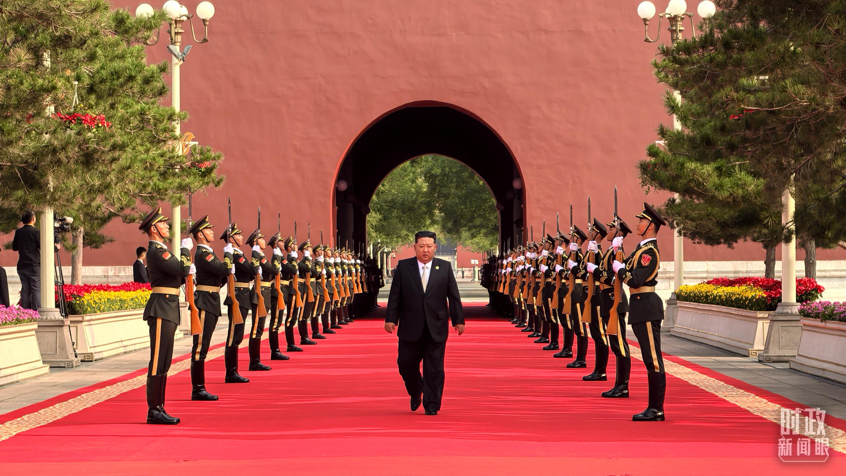 △9月3日上午,金正恩抵達(dá)端門外廣場(chǎng)參加迎賓儀式。(總臺(tái)央視記者李增仁拍攝)