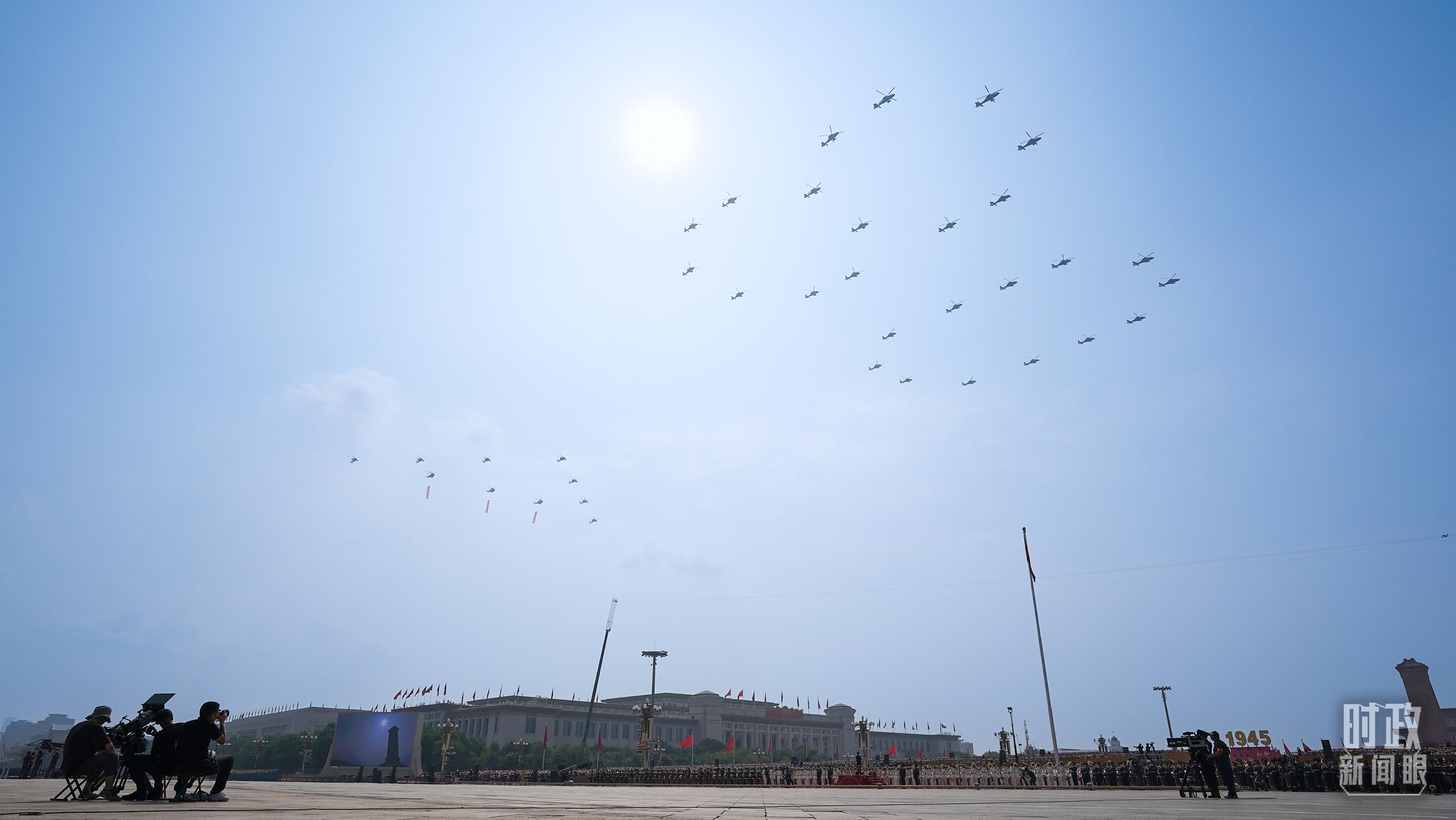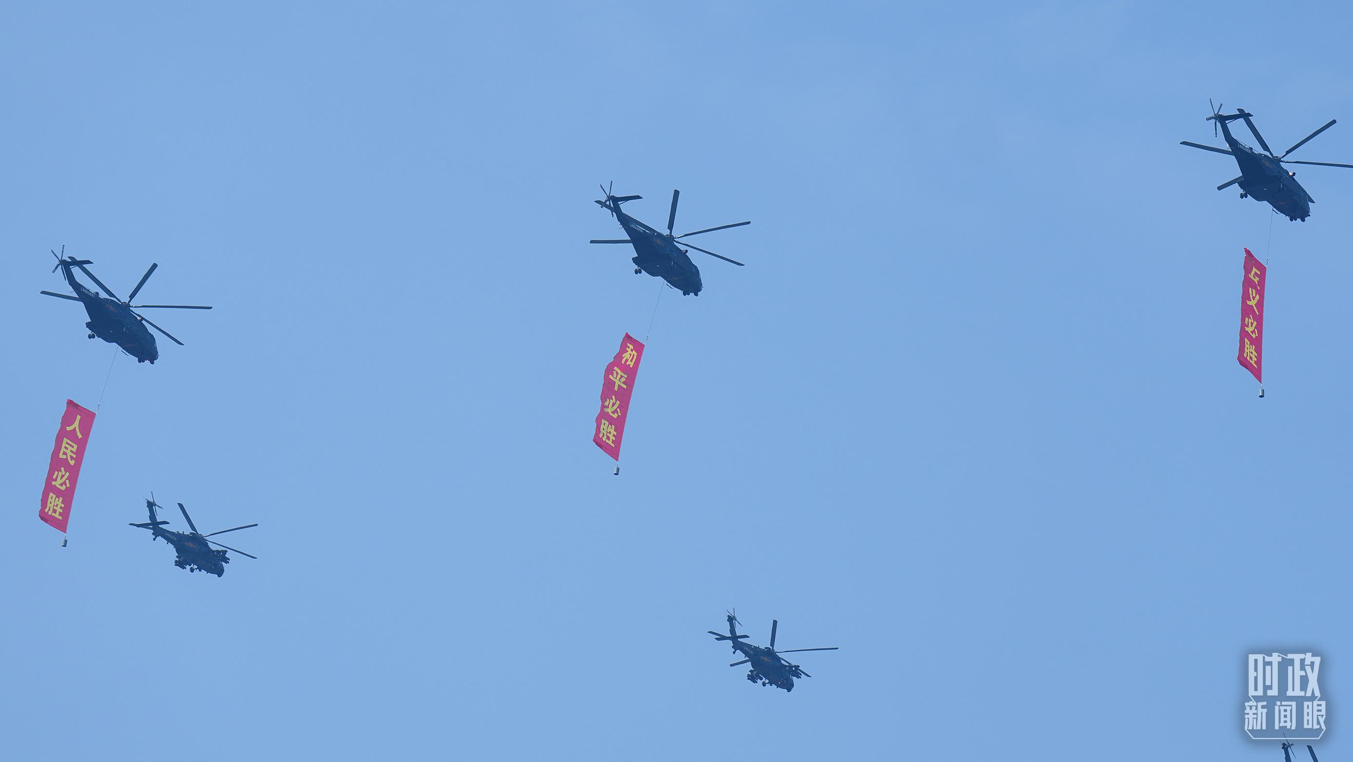 △9月3日,3架直升機(jī)分別懸掛“正義必勝”“和平必勝”“人民必勝”條幅飛過(guò)天安門廣場(chǎng)。(總臺(tái)記者李晉拍攝)