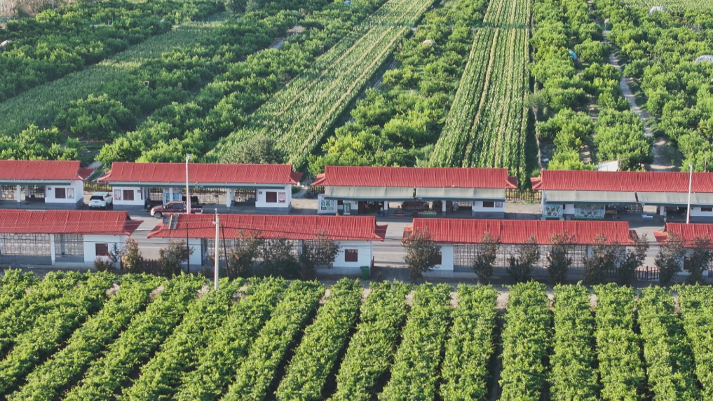 新疆生產(chǎn)建設(shè)兵團(tuán)第八師石河子市一四三團(tuán)九連,桃園綠意盎然,頭戴草帽的果農(nóng)在林蔭下忙活。