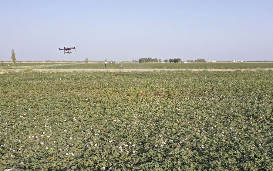 在新疆尉犁縣興平鎮(zhèn)達(dá)西村一處高標(biāo)準(zhǔn)農(nóng)田,種植戶用無人機(jī)噴灑脫葉劑(2022年9月20日攝,無人機(jī)照片)。新華社發(fā)(汪志鵬 攝)