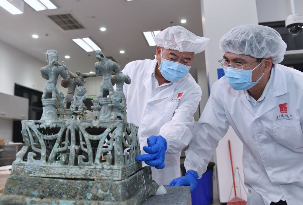 2023年5月30日,在四川三星堆博物館文物保護和修復中心,文物修復師郭漢中(左)與同事討論神壇底座修復方案。郭漢中從事文物修復工作已40余年,深度參與了三星堆祭祀坑的發(fā)掘工作,累計修復文物6000余件?!按蟾胚€有上萬件文物等著修復,需要一代接著一代往下干。”郭漢中說,他要把平生所學傳承下去,培養(yǎng)更多人才。
