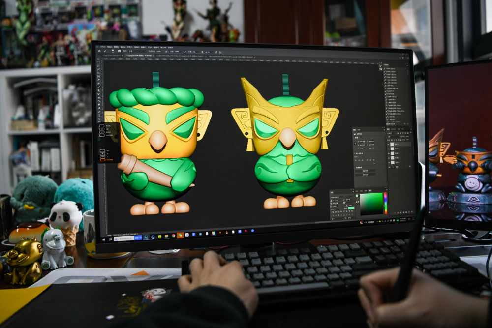 2025年3月1日,文創(chuàng)產(chǎn)品策劃運營師曾舟在位于四川成都的辦公室內(nèi)完善文創(chuàng)產(chǎn)品細節(jié)。他以三星堆青銅神樹、青銅縱目面具、青銅獸面等文物為創(chuàng)作藍本,結合潮玩元素設計的文創(chuàng)作品廣受歡迎。“我想做的不是玩具快消品,而是有內(nèi)容、有溫度、有意義的文化IP,讓年輕一代隨手摸到沉淀千年的文化。”曾舟說。