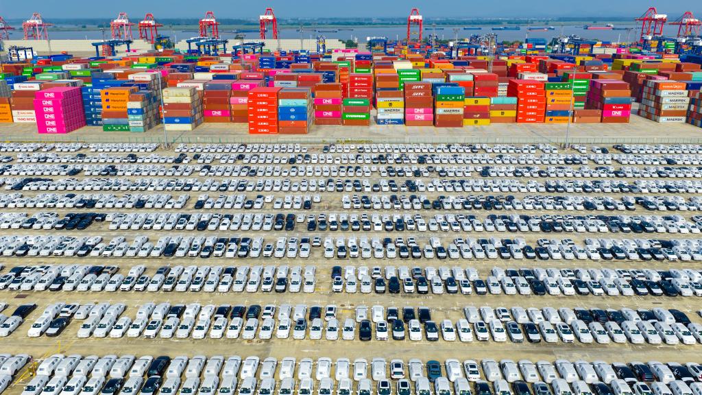 圖為10月4日在江蘇省港口集團南京港龍?zhí)陡蹍^(qū)拍攝的準備裝船出口的汽車(無人機照片)。新華社發(fā)(楊素平攝)