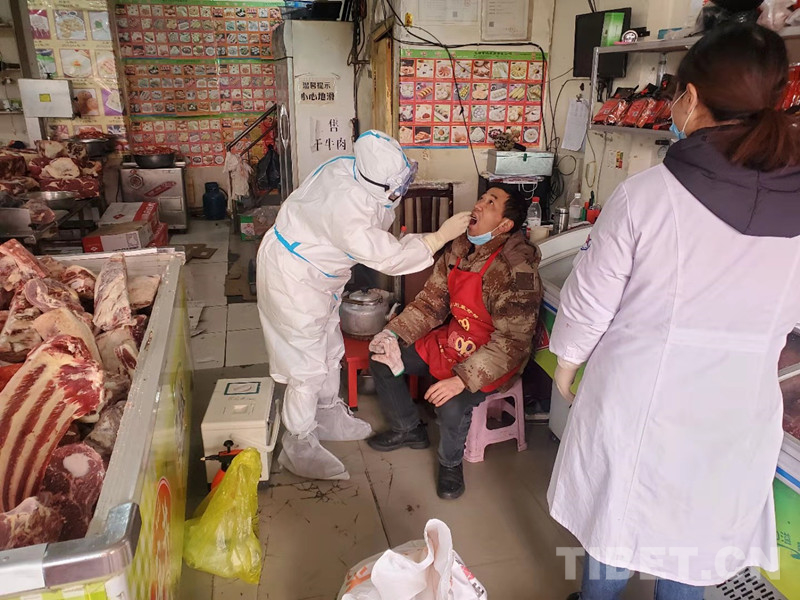圖為醫(yī)務(wù)工作者對(duì)冷鏈?zhǔn)称废嚓P(guān)從業(yè)人員進(jìn)行核酸檢測(cè)