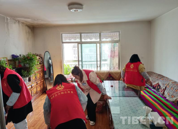 圖為社區(qū)志愿者們在行動不便的老人家里打掃衛(wèi)生