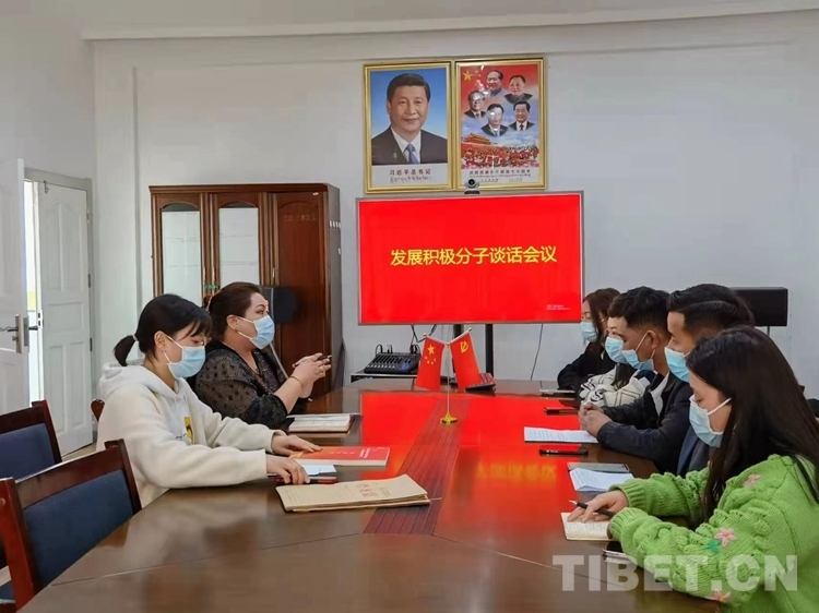 圖為索珍作為老黨員在醫(yī)院內(nèi)與入黨積極分子談話