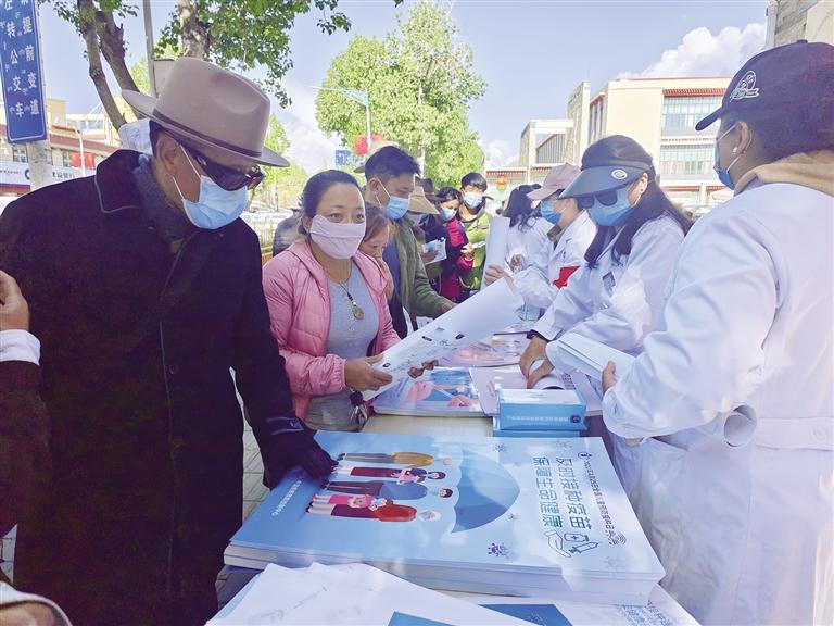西藏自治區(qū)疾控中心工作人員向過往市民發(fā)放宣傳冊(cè)。記者 芮怡星 攝