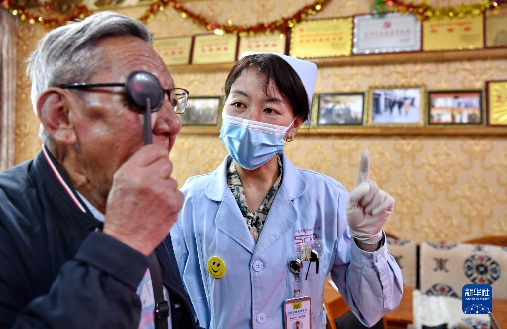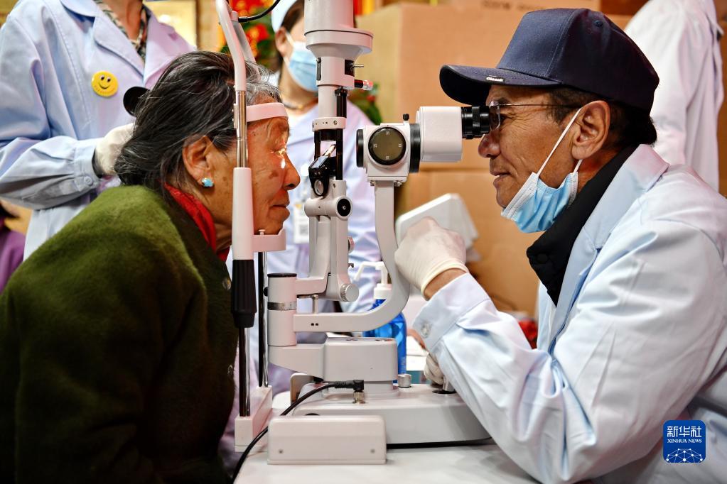 5月9日,醫(yī)務人員為八廓社區(qū)的居民檢查眼睛。新華社記者 張汝鋒 攝
