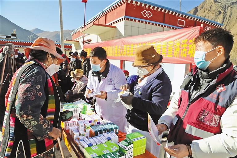 瓊結(jié)縣人民醫(yī)院醫(yī)生在為群眾發(fā)放免費藥品。通訊員 倫珠澤仁 記者 次旺 攝