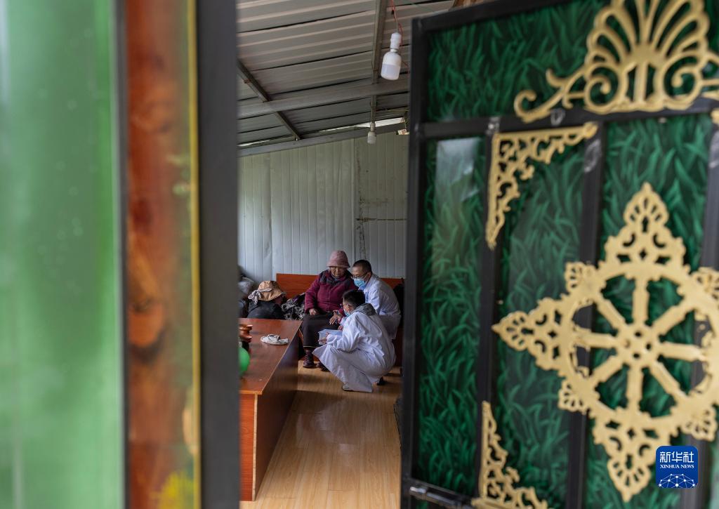 6月12日,王振疆(前右二)、王彤旭(前左一)、陳冰(前右一)和尼瑪益西(前左三)在村委會會議室為患者診治。新華社記者 費茂華 攝