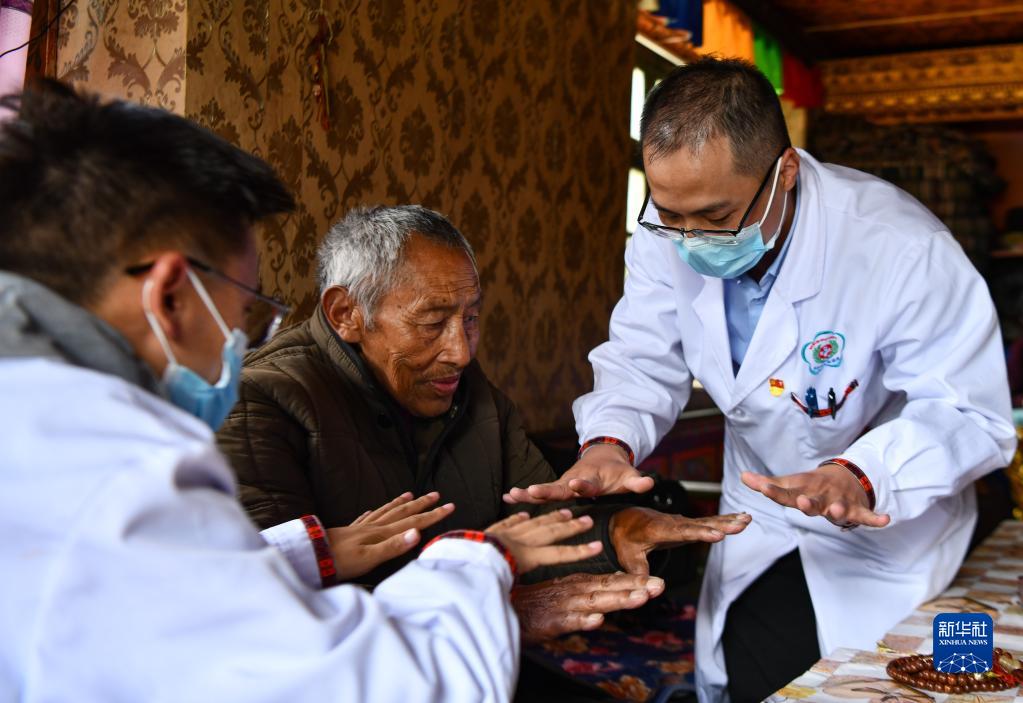 6月12日,王振疆(右)在檢查病人達(dá)杰(中)的手關(guān)節(jié)情況。新華社記者 晉美多吉 攝