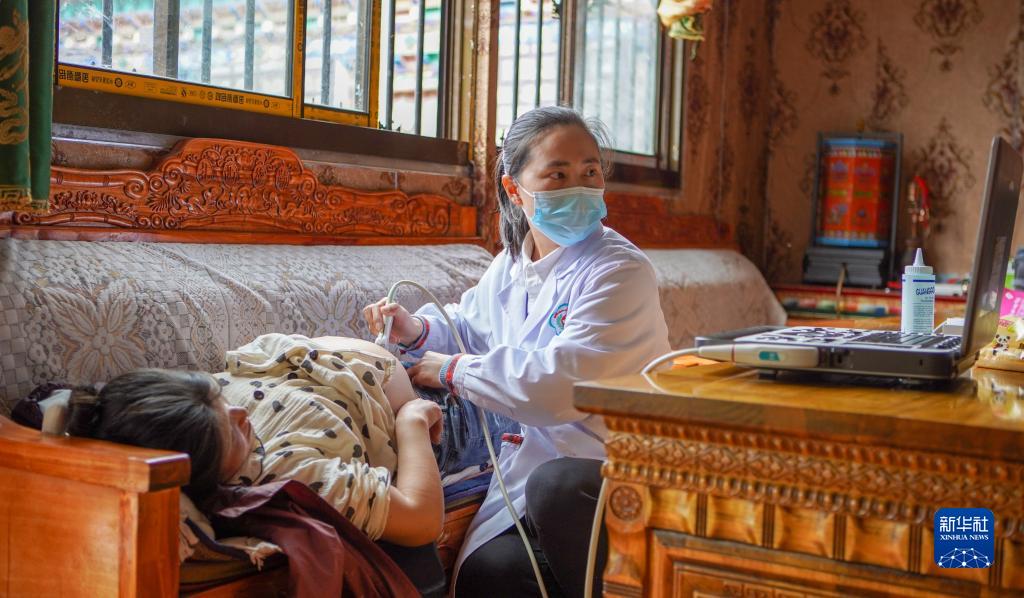 6月12日,王振疆(右)為吞不絨村89歲的村民娘姑進行檢查。新華社記者 費茂華 攝
