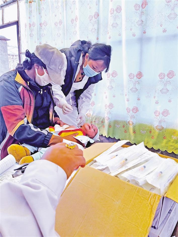 申扎鎮(zhèn)醫(yī)務(wù)人員為兒童注射疫苗。張宇 曲珍 攝
